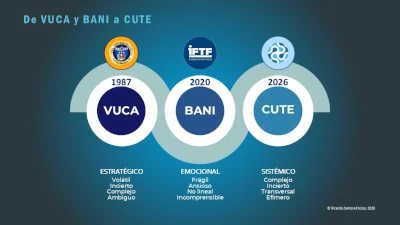 VUCA describe la inestabilidad pero no ofrece respuesta. CUTE (Complejo, Incierto, Transversal, Efímero) señala la cooperación sistemática como solución en entornos interdependientes.